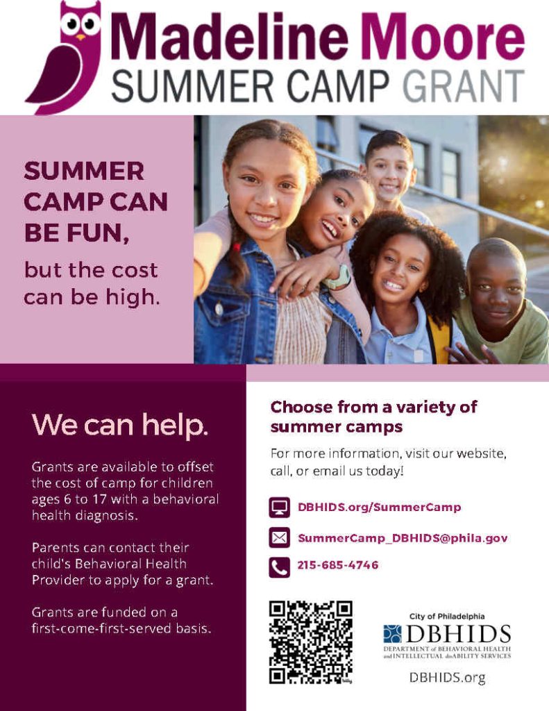 To be eligible for a Madeline Moore Summer Camp Grant, a child must be a Philadelphia resident with a mental health diagnosis between the ages of 6 and 17 who is currently receiving mental health and/or behavioral health services through the summer.